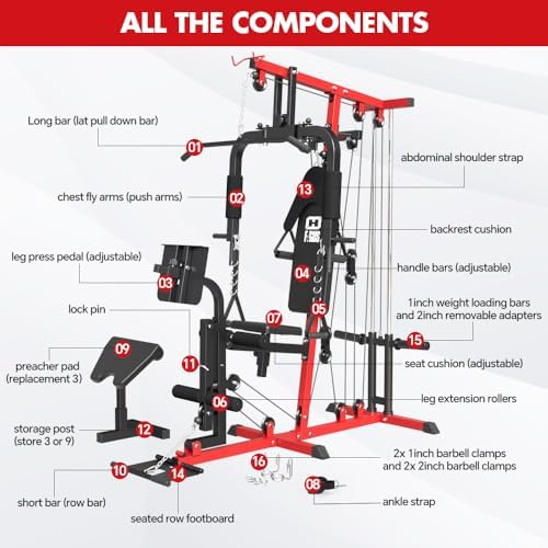 【 ALL THE COMPONENTS INCLUDED】: This home gym system comes with full-body training attachments, which includes 1x lat pull down bar, 1x row bar, 1x ab shoulder strap, 2x handle grips, 1x ankle strap, 1x leg press pedal, 1x preacher pad, 1x storage post, 2x 1inch barbell clamps and 2x 2inch barbell clamps. You are able to get the workout station and all the attachments needed in only one purchase, which will save your time and money.