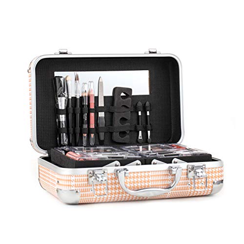 What You Get: Makeup and applicators-27 eye shadows, 4 blushes, 2 lip glosses, 4 lipsticks, 10 brushes, 2 lip pencils, 2 eye pencils. A reusable train case with a built-in mirror-It looks fabulous with cute pink leopard leather and can be used to store your cosmetics, makeup tools, jewelry and watches.
